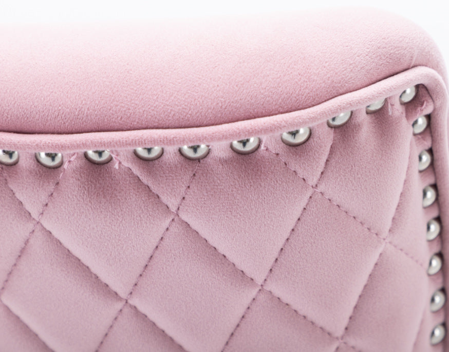 Introduce the J39 Adjustable Height Bar Stool—a luxury retro seating option featuring plush velvet upholstery (available in pink, blue, black, beige, and grey), a tufted diamond-pattern backrest, silver studded trim along the edges, and an optional metallic lion-head accent ring on the back. It is paired with a polished chrome height-adjustable gas lift, a square chrome base, and a circular footrest, blending opulent texture with eye-catching decorative details.